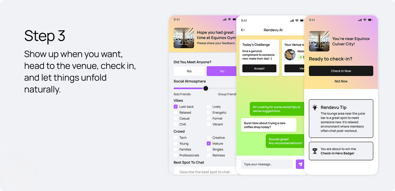 Rendevu helps you meet people who match your energy, naturally, without the awkward setups. This isn't speed dating or a singles event. It's a quiet layer beneath your everyday life, surfacing the spots where genuine connections are most likely to happen. Powered by anonymous data.